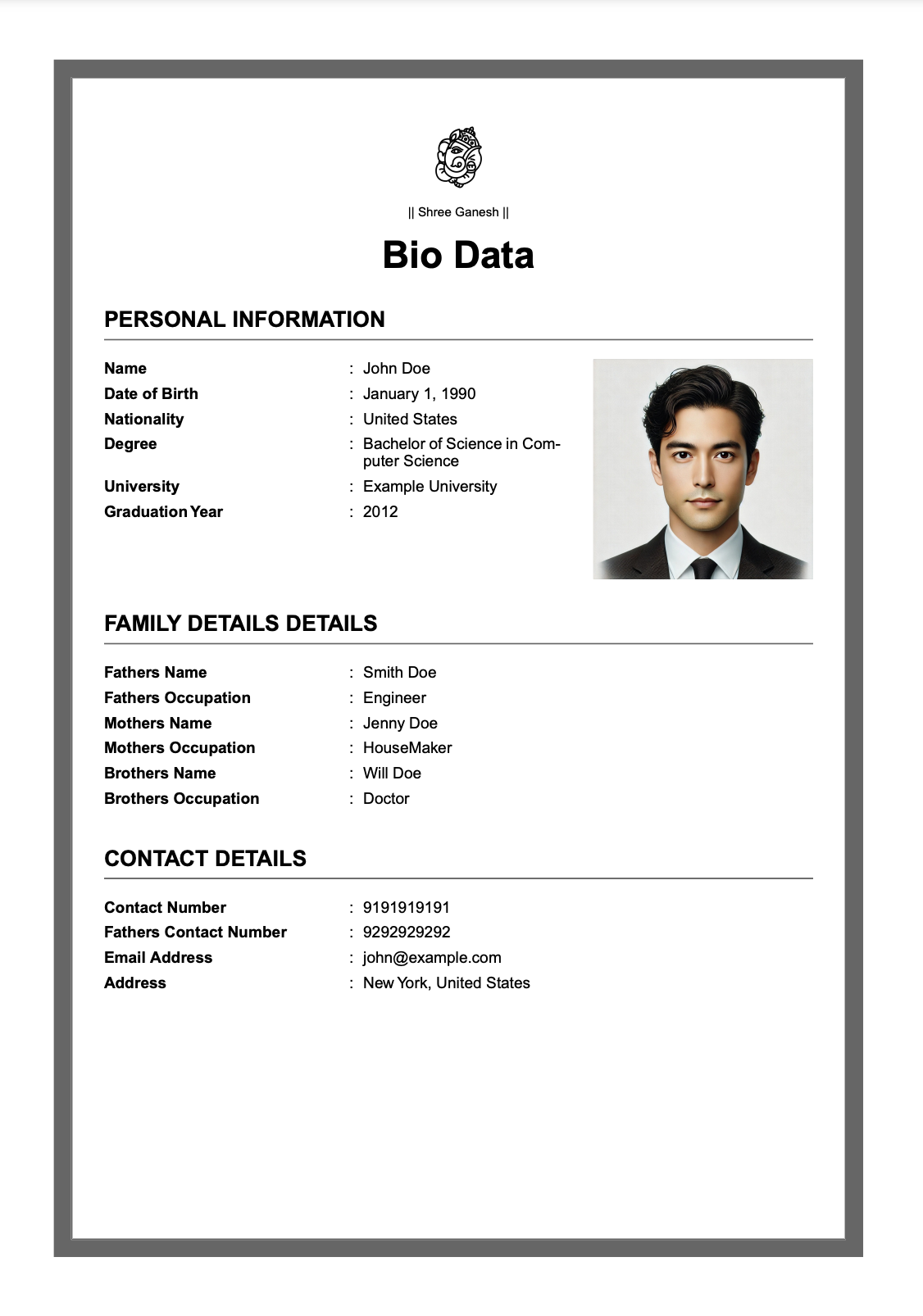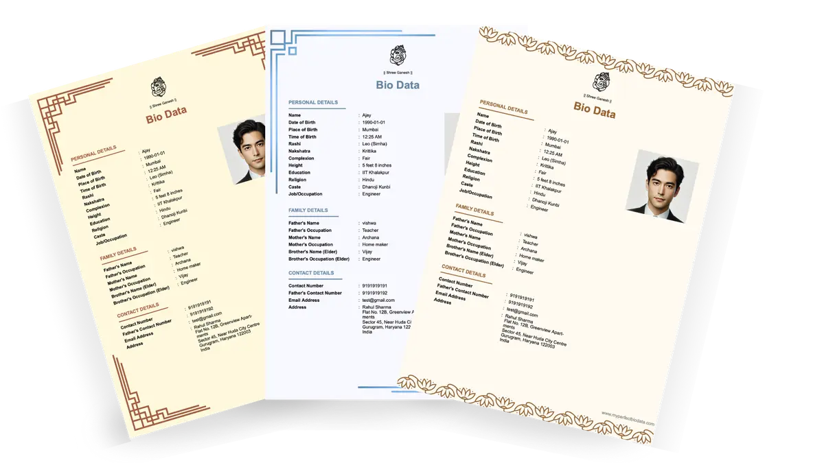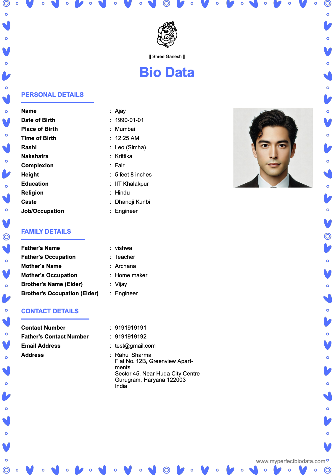 MyPerfectBiodata makes it easy to create a well-structured and visually appealing marriage biodata. With user-friendly templates and customizable sections, it helps present personal details in a clear and professional manner. Whether for matrimonial proposals or introductions, MyPerfectBiodata ensures a great first impression with a beautifully crafted biodata.