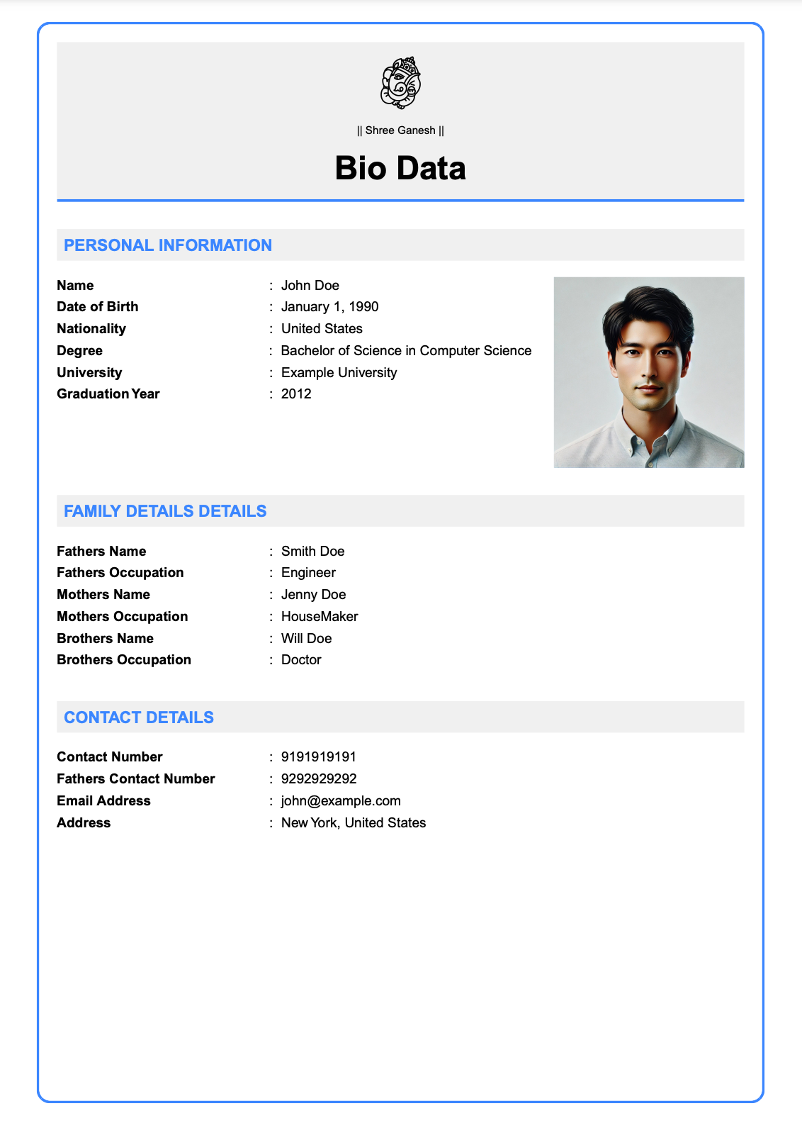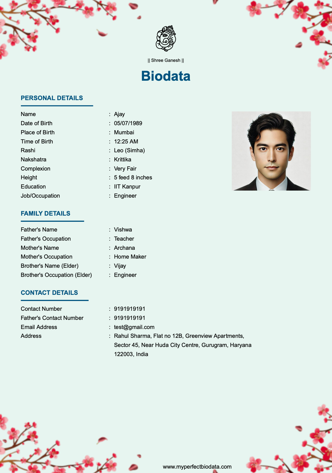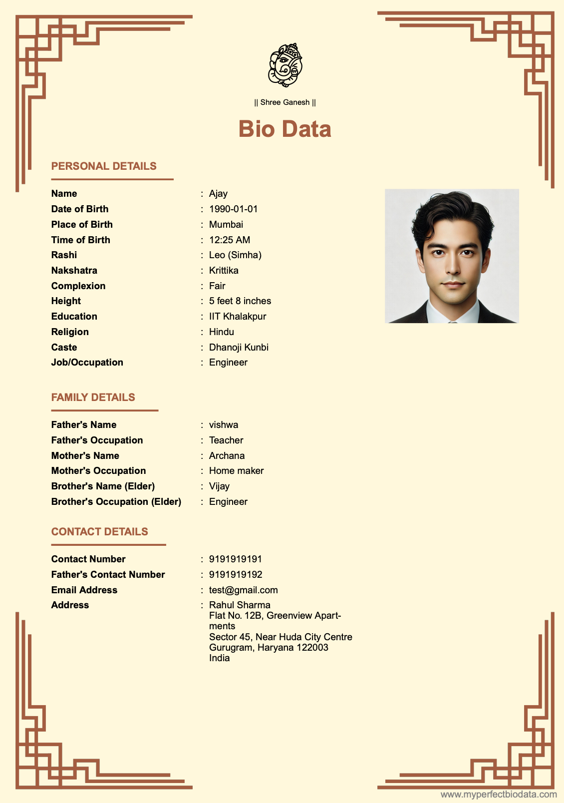 MyPerfectBiodata makes it easy to create a well-structured and visually appealing marriage biodata. With user-friendly templates and customizable sections, it helps present personal details in a clear and professional manner. Whether for matrimonial proposals or introductions, MyPerfectBiodata ensures a great first impression with a beautifully crafted biodata.